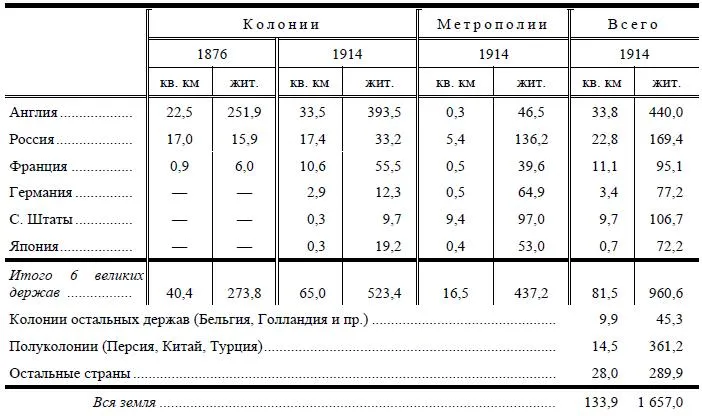 Мы видим тут наглядно, как «закончен» был на границе XIX и XX веков раздел мира. Колониальные владения расширились после 1876 года в гигантских размерах: более чем в полтора раза, с 40 до 65 миллионов кв. км у шести крупнейших держав; прирост составляет 25 млн. кв. км, в полтора раза больше площади метрополий (161/2 млн.). Три державы не имели в 1876 г. никаких колоний, а четвертая, Франция, почти не имела их. К 1914 году эти четыре державы приобрели колонии площадью в 14,1 млн. кв. км, т. е. приблизительно раза в полтора больше площади Европы, с населением почти в 100 миллионов. Неравномерность в расширении колониального владения очень велика. Если сравнить, например, Францию, Германию и Японию, которые не очень сильно разнятся по величине площади и по количеству населения, то окажется, что первая из этих стран приобрела почти втрое больше колоний (по площади), чем вторая и третья, вместе взятые. Но по размерам финансового капитала Франция в начале рассматриваемого периода была, может быть, тоже в несколько раз богаче Германии и Японии, взятых вместе. На размер колониальных владений, кроме чисто экономических условий, и на базе их, оказывают влияние условия географические и пр. Как ни сильно шла за последние десятилетия нивелировка мира, выравнивание условий хозяйства и жизни в различных странах под давлением крупной промышленности, обмена и финансового капитала, но все же разница остается немалая, и среди названных шести стран мы наблюдаем, с одной стороны, молодые, необыкновенно быстро прогрессировавшие капиталистические страны (Америка, Германия, Япония); с другой – страны старого капиталистического развития, которые прогрессировали в последнее время гораздо медленнее предыдущих (Франция и Англия); с третьей, страну наиболее отставшую в экономическом отношении (Россию), в которой новейше-капиталистический империализм оплетен, так сказать, особенно густой сетью отношений докапиталистических.