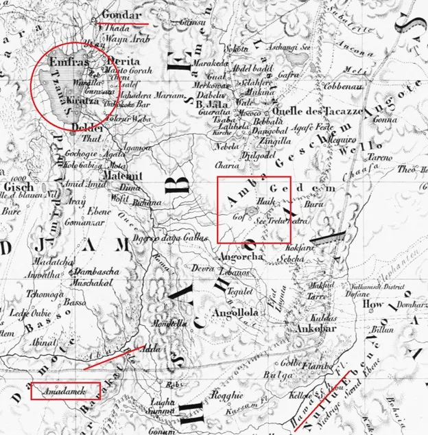 На карте выделены селение Амадамек (город Адама), озеро Тана, город Гондер, река Аваш (когда – то впадавшая в Красное море), озеро Haik (источник райских рек) на амба Кашен.