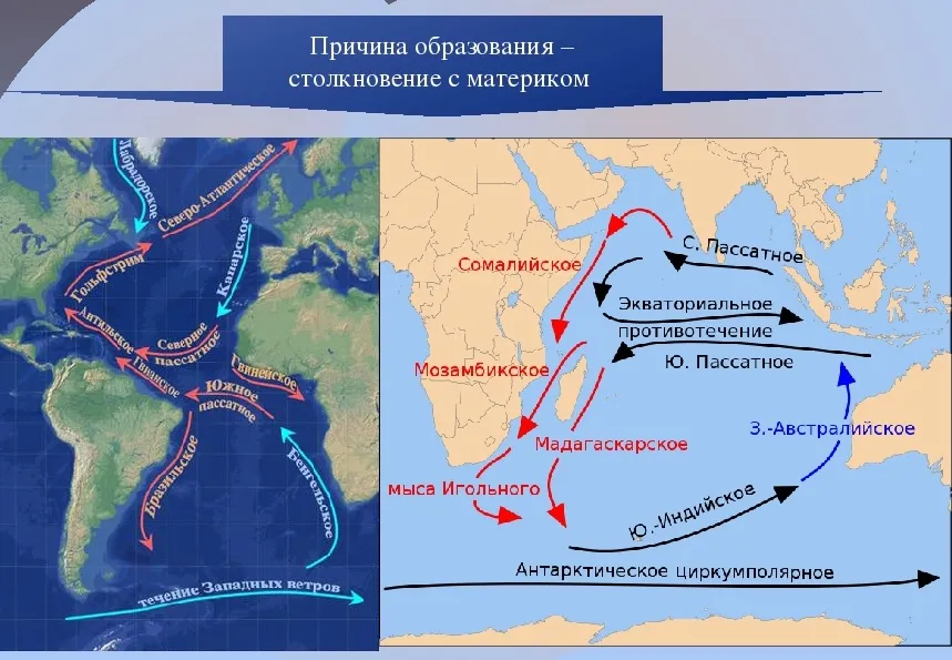 Причина образований тёплых течений горячие точки Afar, Reunion. Холодные течения возникают у ледников Антарктиды.