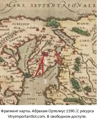 Вследствие того, что северная часть Ладожского озера оказалась выше южной части, сток вод Ладоги в Финский залив проходил по реке Вуокса, или Хейнйокского проливу, который постепенно мелел, теряя своё значение как стока вод Ладоги при тектоническом поднятии Балтийского щита. Следы древнего судоходного хода от Ладоги (Кексгольма) по системе озёр Вуокса, Сайменские к Выборгу и сегодня можно видеть недалеко от остатков Тиверской крепости в виде металлических крюков, забитых в валуны, для подвески фонарей и размечавших фарватер в тёмное время. На фрагменте карты ниже цифрой з отмечен Финский залив. Цифрой 2 Ладожское озеро и пролив от Финского залива к Ладоге. Цифрой 1 система озёр Вуокса, Сайма, (Хайнйокский пролив).
