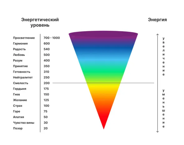 Как вы видите, чувства человека несут в себе определенную вибрационную волну (обозначено цифрами). То есть, в зависимости от чувств, молекулы физического и энергетического тел колеблются на той или иной частоте, словно радиоволны. Если вы испытали, к примеру, вину, то уровень вашей энергии опускается и «сливается». Вы ощущаете, как вам становится плохо. Если же нагрянула любовь, то вы почувствуете такой прилив энергии и бодрости, что готовы горы свернуть.