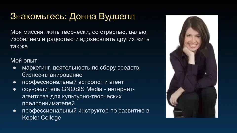 Итак, меня зовут Донна Вудвелл. Для тех, кто не знает меня… Те, кто уже был на моих лекциях, знают, что моя главная задача – поддерживать у публики весёлое настроение, потому что если вы не будете смеяться, особенно после обеда, то точно уснёте. А если вы уснёте, то ничему не научитесь. Так что, если я время от времени буду говорить какие-то дурацкие вещи, то просто ради того, чтобы вы проснулись, обратили на меня внимание и включились в процесс. Ведь люди вовлечённые всё запоминают и, возвращаясь домой, всё ещё помнят то, что услышали на лекции. Это делает меня такой счастливой!