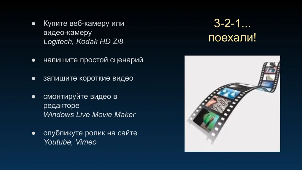 Например, можно купить карманную флип-камеру Kodak Zi8. С нею я провела много экспериментов и реально её полюбила. Всё, что вам нужно сделать, это включить камеру, дать ей настроиться и нажать красную кнопку. Там же на экране можно посмотреть снятое видео. Многие таким образом делают феноменальные видео для YouTube.