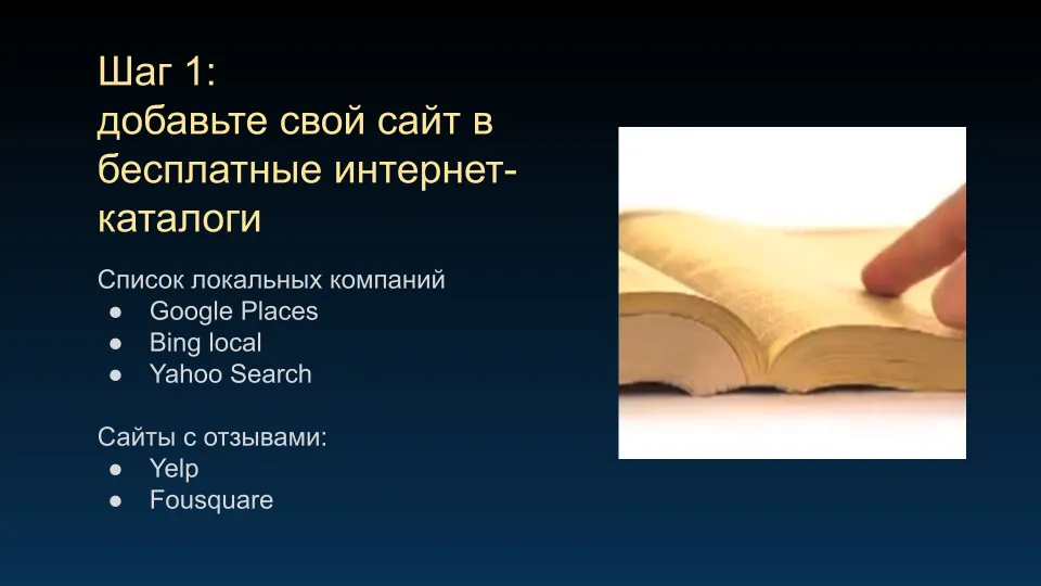 Но у нас появилось и другое место, где надо быть заметным, – это интернет. Простое и бесплатное (реально не требующее затрат) место, где можно начать с любого уровня и быть у всех на виду. И сделать свой сайт более известным, например, добавив его во всякие бизнес-каталоги. У вас это займёт всего лишь полдня, и вы это сможете сделать, попивая чаёк в приятной атмосфере с зажжённой свечкой.