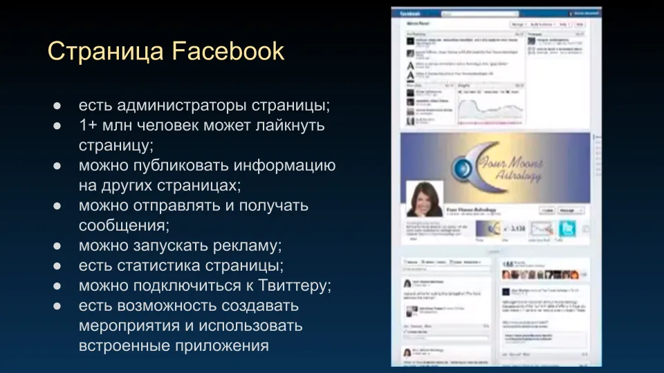 С помощью личной страницы вы можете размещать информацию от вашего имени где угодно – в личном профиле, в профиле своих друзей; на любой странице, которая вам понравилась; в любой группе, участником которой вы являетесь. Также вы можете создавать собственные группы и страницы, через которые можно отправлять и получать личные сообщения. Также вы можете связать свой профиль с Twitter, чтобы туда репостились ваши публикации. И вообще, есть целый ряд приложений, которые можно подключить к Facebook для расширения базового функционала.