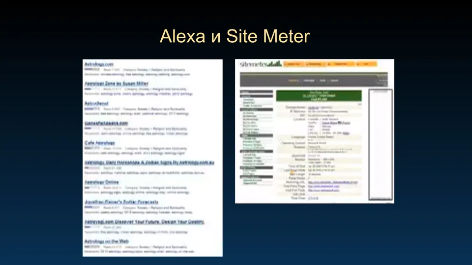 У Alexa есть система ранжирования, и она одна из лучших в мире. Если вбить там слово «астрология», то первым делом высветится astrology.com, и это неудивительно. Далее идёт Зона астрологии Сьюзан Миллер, Astrodienst… а мы там все внизу рейтинга. Если кликнуть по каждому из этих пунктов, то выйдет более подробная информация об этих сайтах, откуда трафик к ним приходит. Так вы можете изучить своих конкурентов и увидеть, что делают другие люди. Для этого нужно набрать в поиске Alexa названия интересующих вас сайтов, и она выдаст вам всю информацию.15