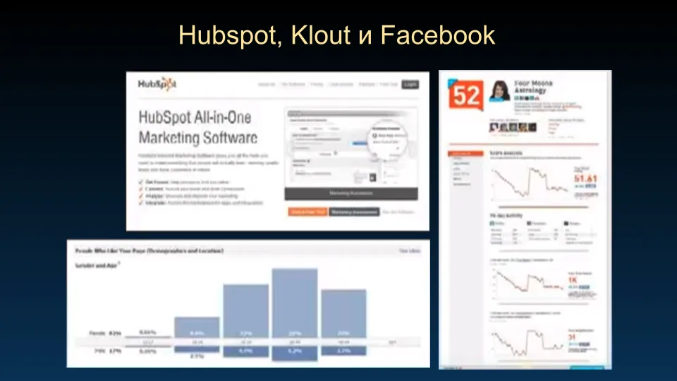 У Hubspot много статистических инструментов, которые можно подключить к себе на сайт и увидеть, как он функционирует (по разным категориям): как выглядит аналитика вашей Twitter-ленты, насколько успешны ваши маркетинговые акции. Просто подключаетесь и смотрите. Вам предоставят все варианты просмотра статистики.