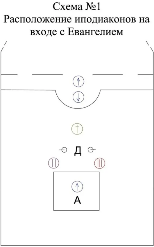 При служении других архиереев посошник становится между солеей и архиерейским амвоном («кафедрой») лицом к владыке. Остальные иподиаконы становятся так, как это указано на схеме №1.