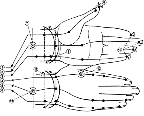 1 – таиин: иньский энергетический поток, или меридиан легких; 2 – кэцуин: иньский энергетический поток, или меридиан перикарда; 3 – сеин: иньский энергетический поток, или меридиан сердца; 4 – йомэй: янский энергетический поток, или меридиан толстого кишечника; 5 – сиое: янский энергетический поток, или меридиан «трех обогревателей»; 6 – тайо: янский энергетический поток, или меридиан тонкого кишечника; 7 – нэй-гуань: точки выше лучезапястной складки в центре запястий, на внутренней поверхности кистей рук. В мудротерапии применяются при болях в сердце, неврозах, расстройствах сна, болях в лучезапястном суставе, нормализуют артериальное давление; 8 – ши-сюань: точки на верхних фалангах больших пальцев кистей рук; 9 – шэнь-мэнь: точки в лучезапястной складке во впадине на линии мизинца; 10 – ши-сюань: точки на верхних фалангах мизинцев, безымянных, средних и указательных пальцев кистей рук. В мудротерапии применяются при гормональных расстройствах, нарушениях менструального цикла, патологии печени, заболеваниях малого таза, а также для улучшения эластичности кожи; 11 – ле-цюе: точки между нэй-гуань и бугорком на линии больших пальцев кистей рук. В мудротерапии применяются при заболеваниях органов дыхания, бронхиальной астме, лицевых болях; 12 – хэ-гу: точки на уровне вершины кожной складки, между большим и указательным пальцами кистей рук. Отвечают за снятие головных и лицевых болей, в мудротерапии применяются при заболеваниях органов дыхания, желудочно-кишечного тракта, а также для поднятия жизненного и мышечного тонуса; 13 – точка вай-гуань: точки в центре запястий, чуть выше лучезапястной складки, находятся напротив нэй-гуань. Могут быть задействованы в мудрах со скрещенными кистями рук при суставных болях, шейном радикулите, астении, бессоннице, заболеваниях желудочно-кишечного тракта.