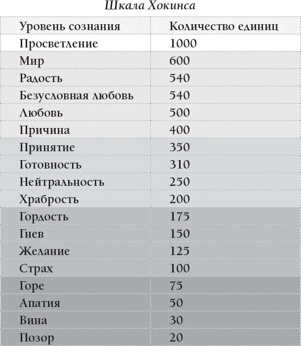 Всего, по Хокинсу, существует 18 уровней сознания. Самые низкие – «позор», «вина», «апатия», «горе». Самые высокие, не считая «просветления», – это «мир» и «радость» – 600 и 540 единиц соответственно.