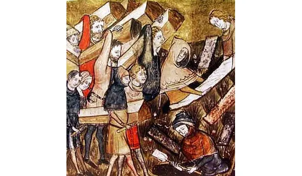 Илл. 2. Похороны жертв чумы в Турне. «Хроники Жиля Ли Муисиса» (1272—1352), настоятеля монастыря Святого Мартина Праведного. Королевская библиотека Бельгии
