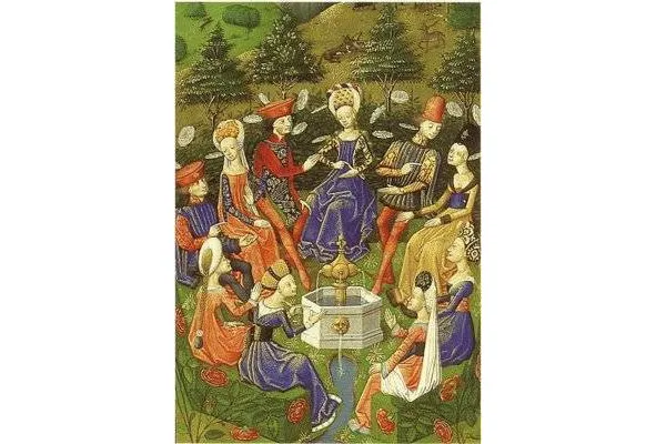 Илл. 3. Рассказчики «Декамерона». Миниатюра XIV века