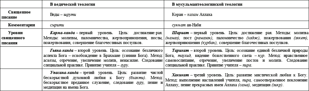 Для наглядного восприятия схожих элементов ведической и мусульманской науки о познании нарисуем таблицу.