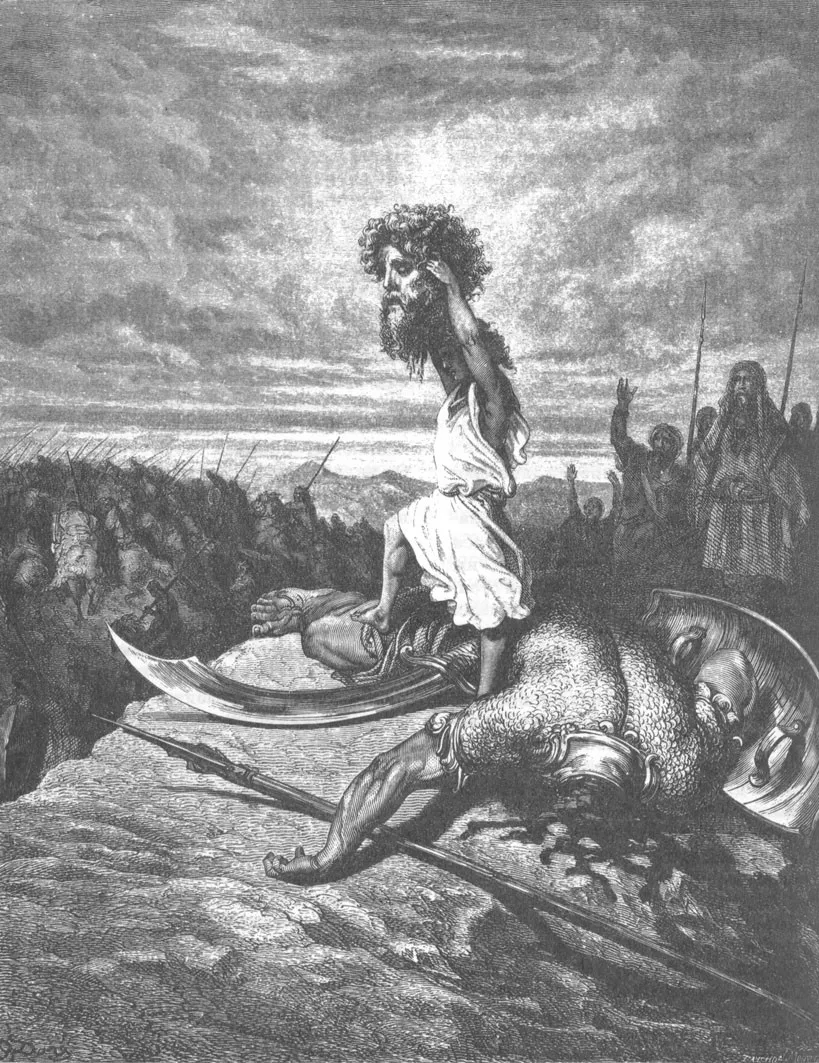 И когда Голиаф стал приближаться, Давид взял пращу, вложил в нее камень и запустил его с такой силой: «так что камень вонзился в лоб его, и он упал лицом на землю» (17:49). Давид взял меч Голиафа, наступил на тело ногой и одним взмахом отрубил ему голову.