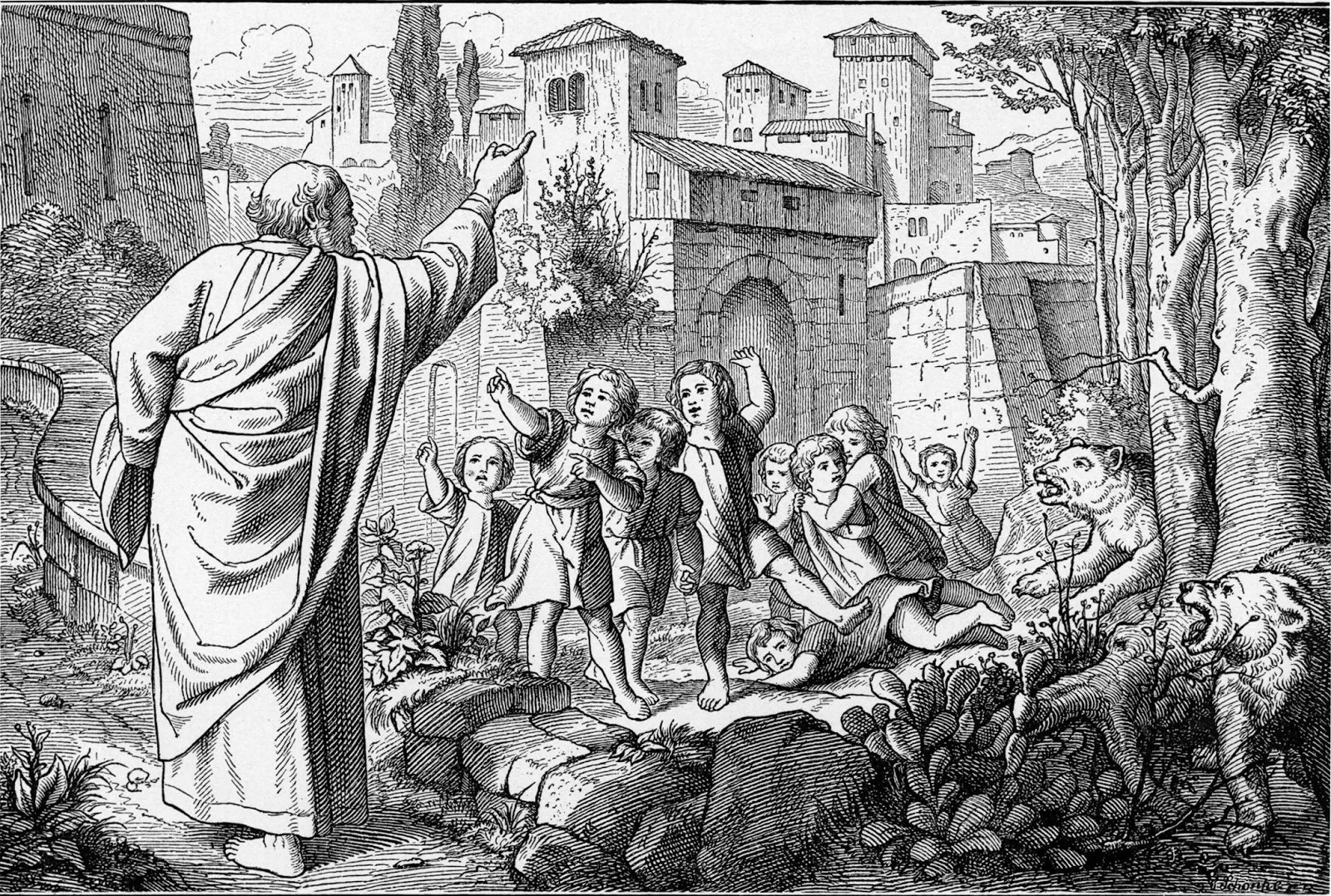 Когда он шел по дороге мимо города, малые дети стали дразнить его: «иди плешивый! иди плешивый!» (2:23). Елисей рассердился, проклял их именем Господа, и тогда: «И вышли две медведицы, и растерзали из них сорок два ребенка» (2:24). Вот такой был пророк Елисей, которому убить детей – плевое дело, пусть не дразнятся.