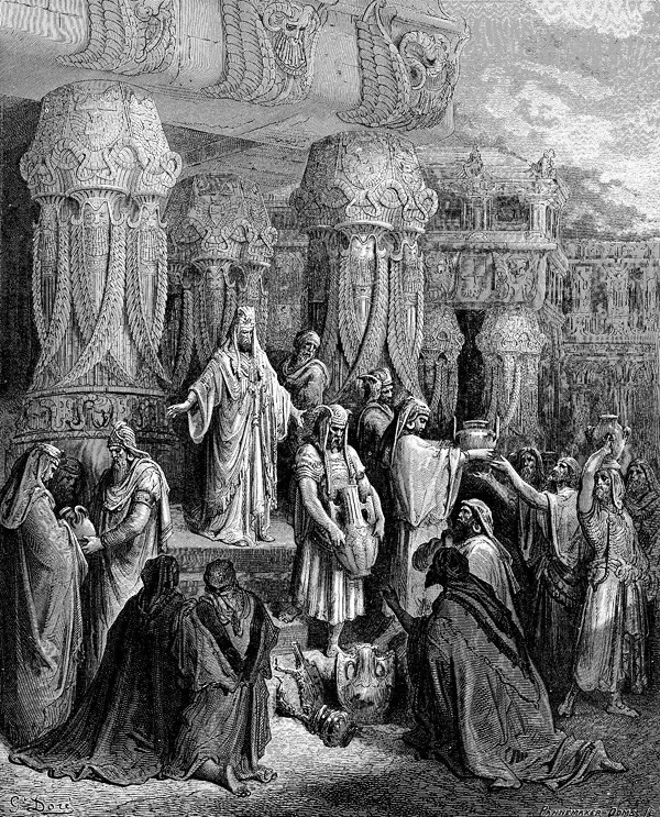 И начали евреи переселяться в Иудею, в Иерусалим, всего сорок две тысячи человек с рабами, лошадьми, верблюдами и ослами. Кир отдал им сосуды, изъятые Навуходоносором из дома Господня, тарелки, чаши и прочее храмовое имущество. Священники поставили жертвенник и начали совершать всесожжения. На второй год заложили фундамент храма, а священники стали регулярно трубить и петь хвалу Господу.