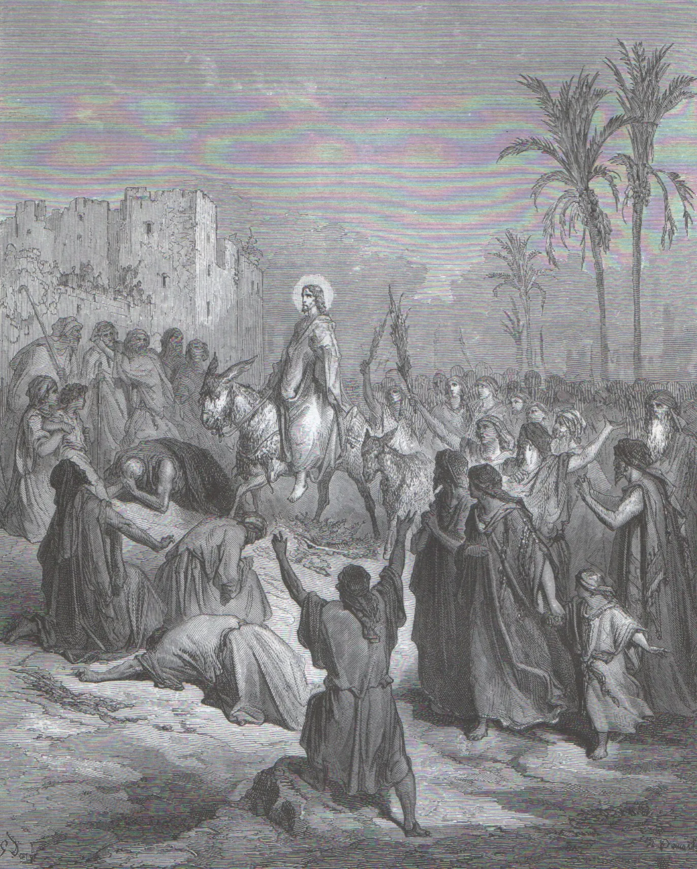 При этом ученики его громогласно славят, народ кричит «осанна», бросают под ноги пальмовые ветви, и Иисус въезжает в Иерусалим во славе народной, что оберегает его от покушений. Там он опять вступает в храме как обличитель, имеющий власть свыше, но времена изменились, пик славы прошел, Иисус и ученики его явно опасаются ареста.