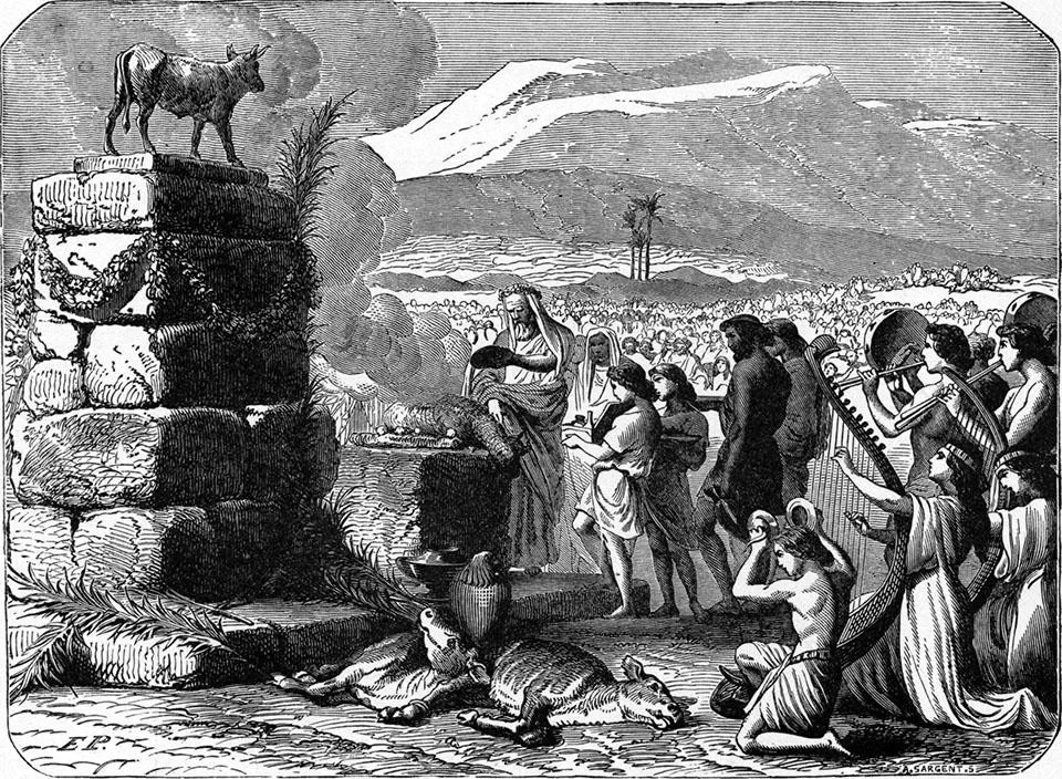«И весь народ вынул золотые серьги из ушей своих, и принесли их к Аарону. Он взял их из рук их, и сделал из них литого тельца, и обделал его резцом. И сказали они: вот бог твой, Израиль, который вывел тебя из земли Египетской! Увидев сие, Аарон поставил перед ним жертвенник, и провозгласил Аарон, говоря: завтра праздник Господу. На другой день они встали рано, и принесли всесожжения, и привели жертвы мирные: и сел народ есть и пить, а после стал играть» (32:3-6).