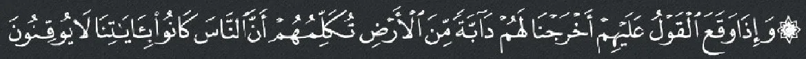 «Когда же свершится над ними Слово, Мы выведем к ним из земли животное, которое скажет им, что люди не были убеждены в Наших знамениях». (Сура «Муравьи» (ан-Намль), аят 82).