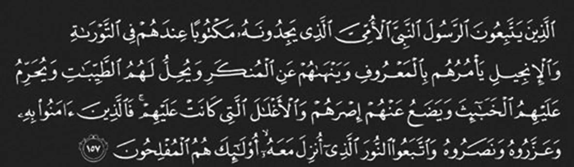 «…которые последуют за посланником, неграмотным (не умеющим читать и писать) пророком, запись о котором они найдут в Таурате (Торе) и Инджиле (Евангелии). Он повелит им совершать одобряемое и запретит им совершать предосудительное, объявит дозволенным благое и запрещённым скверное, освободит их от бремени и оков. Те, которые уверуют в него, станут почитать его, окажут ему поддержку и последуют за ниспосланным вместе с ним светом, непременно преуспеют». (Сура «Преграды» (аль-Аграф), 157 аят).