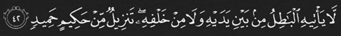 «Ложь не подберётся к нему ни спереди, ни сзади. Оно ниспослано от Мудрого, Достохвального». (Сура «Разъяснены», 42 аят).