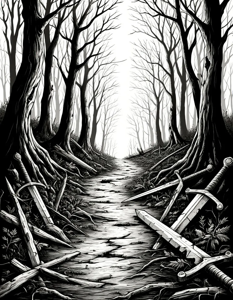Земля под ногами была усыпана каким-то странным пеплом. И каждый десяток шагов в землю был вонзён клинок. Некоторые ˗ сломанные, другие ˗ потемневшие от времени. Были мечи с трещинами, с пустыми рунами, с обломанными рукоятями. Они стояли, будто могильные кресты, и молчали. Но в этом молчании было больше слов, чем в любом крике.