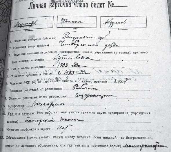 Личная карточка члена РКСМ Акжигитова Исмаила Абдулловича, Кутеевка, 1924 г. (ГАПО, ф.38, оп.2, д.17)