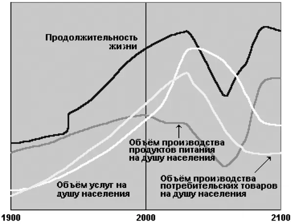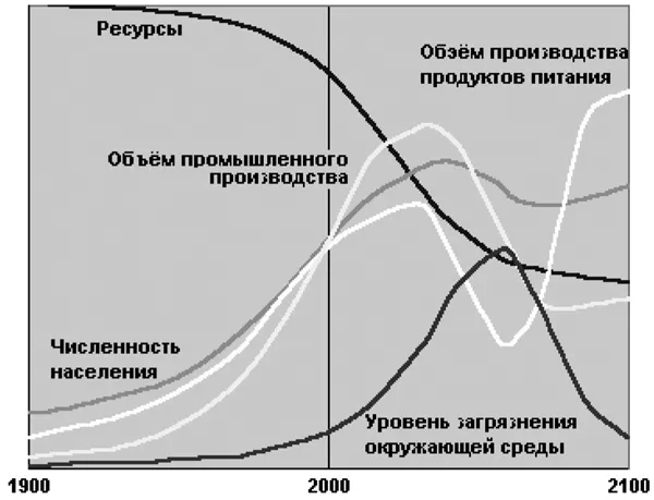 Как отмечалось, у человечества есть выбор. Возможен от образа жизни и действий, характерных для сценария 1, переход к активным действиям по сценарию 10, хотя бы с определенным опозданием. Такой переход авторы названных книг иллюстрируют в сценарии 12, по которому действия, предполагавшиеся осуществить в 1995 году по сценарию 10, люди начинают осуществлять только в 2015 году. «Откладывание перехода к политике устойчивого развития до 2015 года приводит к чрезмерному росту численности населения, объема промышленного производства и уровня загрязнения окружающей среды. Даже применение эффективных технологий не позволяет предупредить экономический спад, хотя в конце XXI века и наблюдается прекращение роста»17 (см. рис. 3). Мировое сообщество развивается как всегда, самотеком, без каких-либо политических и социально-экономических изменений, что имеет место и сегодня.