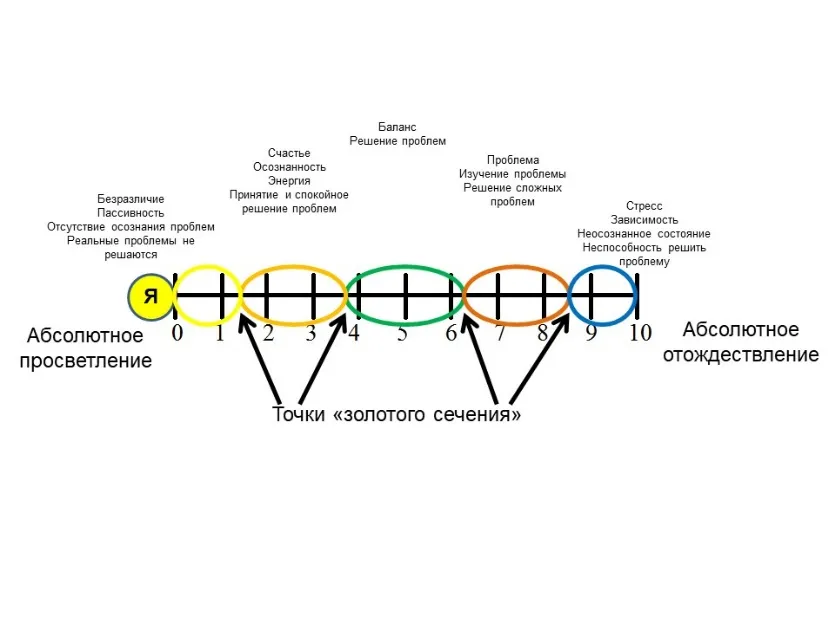– Воспримите пока, как есть. Позднее я вам обязательно расскажу про данные зоны поподробнее. Сейчас, нам нужно знать, что есть шкала просветления. По ней мы передвигаемся в процессе жизни, меняя степень. Величиной просветления можно управлять. Пять зон на шкале называются отрешение, энергия, баланс, стресс, разрушение. Зона отрешения даёт блаженство, но не решает проблемы. Энергия – предпочтительная зона. Сочетание максимального просветления с умением определять и решать проблемы. Баланс – зона для повседневной жизни. Из неё мы можем переходить в соседние зоны, в зависимости от ситуации. Стресс – зона погружения в проблему, для её решения. Потеря жизненных ресурсов. Можно находиться непродолжительное время. Разрушение – запретная зона. Полное и деструктивное отождествление. Осознанно управляя своим положением на шкале, мы можем эффективно решать жизненные проблемы и сохранять энергию.