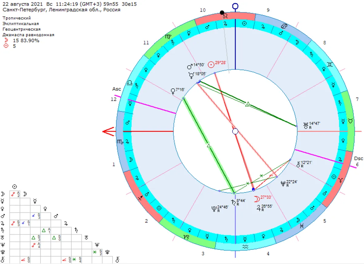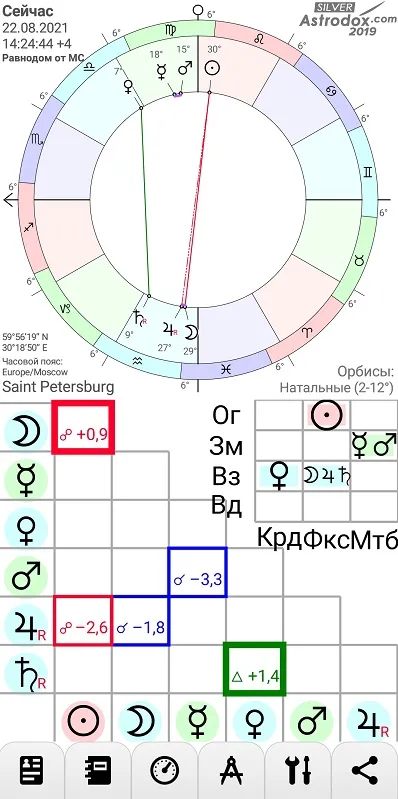 Расходящийся аспект отображается символом “S” и числом градусов (округленным) в таблице аспектов (в нижней левой части экрана). На астрокарте, при наведение курсора на линию аспекта, отображается его название и “<N°N’>” точное количество градусов до наступления полного аспекта.
