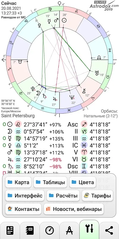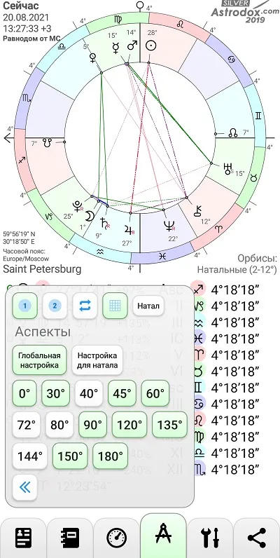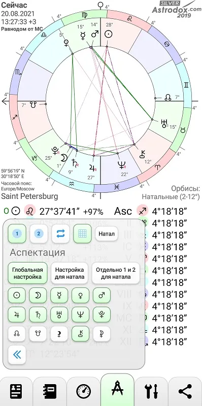 Для удобства приводим набор скриншотов основных астрологических настроек, настройки интерфейсных можете подобрать под себя самостоятельно, руководствуясь приведенным далее скриншотом интерфейса программы.