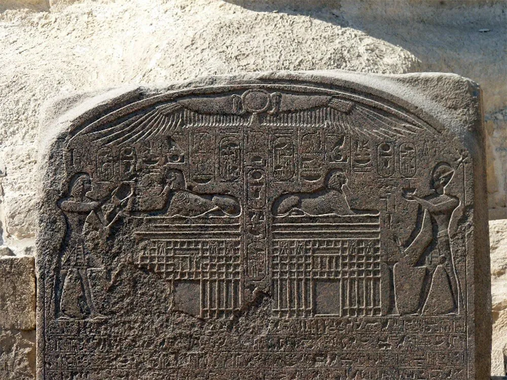 То, что Большой Сфинкс во времена правления фараона Хеопса уже был занесён песками пустыни, это доказывает надпись на т.н. «Инвентарной стеле», обнаруженной около Сфинкса французским египтологом Франсуа Мариетом в 1857 году. Эта стела была создана незадолго до персидского завоевания (т.е. до 522 года до н.э.). Так вот, надпись на этой стеле говорит о том, что обветшавшую статую Сфинкса выкопал и очистил от песка отец фараона Хефрена, фараон Хеопс (Хуфу).