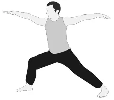 Из положения стоя делаем широкий шаг вперед правой ногой. Пальцы правой стопы смотрят вперед. Пальцы левой стопы развернуты под 45° вперед. Правая нога в согнутом положении, бедро параллельно полу. Разворачиваем правое плечо вперед, правую руку вытягиваем вперед. Левое плечо разворачиваем назад и левую руку вытягиваем назад. Вес тела распределяем на две стопы, следим за тем, чтобы не заваливаться корпусом вперед (РИС. 26). Так же и на другую сторону.