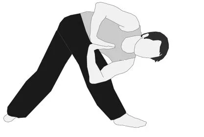 Исходное положение – стоя. Делаем широкий шаг правой ногой вперед. Пальцы правой стопы смотрят вперед, пальцы левой стопы развернуты под углом 45°. С прямой спиной делаем наклон вперед, к правой ноге. Левую ладонь укладываем за правую стопу на пол. Поднимаем правую руку вверх и разворачиваем правое плечо назад. Спина прямая, плечи на одной линии с правой ногой. Таз параллелен полу. Сгибаем руки в локтях, ладони складываем в Намасте перед грудью. Левым локтем цепляемся за правую голень или бедро. Ноги сильные и прямые. Спина прямая, но мышцы спины и живота расслабленые (РИС. 33). Так же и на другую сторону.