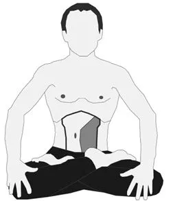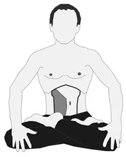 Когда прямыми мышцами живота мы делаем вращение слева направо (против часовой стрелки), то это называется Дакшина Наули (РИС. 7); по часовой стрелке (справа налево) – Вама Наули (РИС. 8). Когда прямые мышцы живота стянуты вместе и мы выталкиваем их вперед – это называется Мадхьяма Наули (РИС. 9, а).