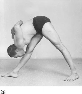 6. С выдохом наклонитесь вперед и опустите голову на правое колено. Вытяните спину, а затем постепенно удлините шею так, чтобы нос, губы и в последнюю очередь подбородок оказались на правой голени (фото 26). Подтяните коленные чашечки обеих ног вверх.