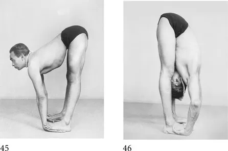 2. Не сгибая ноги в коленях, с выдохом наклонитесь вперед и поместите ладони под стопы (фото 45).