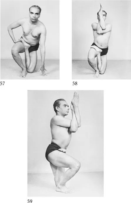 2. Опустите руки на пол по обеим сторонам от таза. С выдохом поднимитесь и опустите левое колено на пол. Приблизьте правую стопу к левому колену, удерживая правое бедро параллельно полу (фото 57).