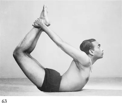 В асане позвоночник вытягивается назад, что полезно для пожилых людей, поскольку с возрастом позвоночник утрачивает гибкость. Мой опыт свидетельствует, что Дханурасана, так же как и Шалабхасана (фото 60), идеальна при смещении межпозвонковых дисков: ученики, регулярно практиковавшие ее, избавлялись от проблемы без всякого лечения. Поза также повышает активность органов брюшной полости.