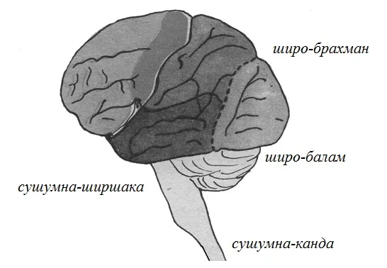Полученная от органов чувств (джнянендрий) и внутренних органов информация по периферическим нервам направляется в центральную нервную систему, мозг, где она анализируется и обрабатывается. В результате обработки полученной информации ум вырабатывает команды, направляемые к органам действия (кармендриям), скелетным мышцам и внутренним органам.