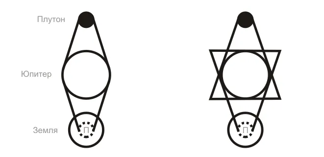 Сформировалась вот такого вида конфигурация, вот так выглядело соединение. Юпитер отразил ток Плутона и спроецировал его в Землю. При этом ток Плутона был модулирован Юпитером. Расширен, смягчён, обогащён, и т.п. Это был не прямой плутоновский удар по земной голове, а достаточно мягкий отцовский посыл-проекция, тем не менее несущая основные темы и моменты посыла.