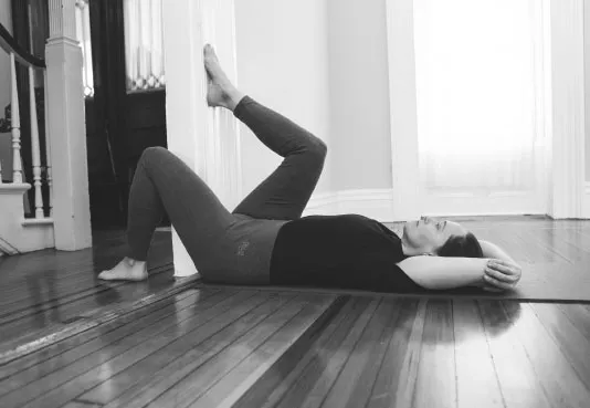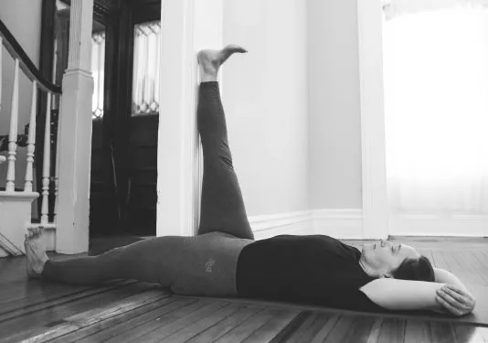 Примечание: при грыже поясничного отдела позвоночника подколенные сухожилия могут быть жесткими и укороченными. Если вам больно выпрямлять ногу вдоль дверного косяка, лягте дальше от стены. Двигайтесь медленно. Вытяните руки над головой и обхватите руками локти или положите руки вдоль тела.