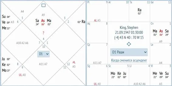 Например, в карте выше Марс как бы стоит в 5 доме с Юпитером, Кету и Луной. Поэтому помимо реального соединения Марса с Сатурном, здесь также есть мысленные соединения Марса с Юпитером, Марса с Кету, Марса с Луной.