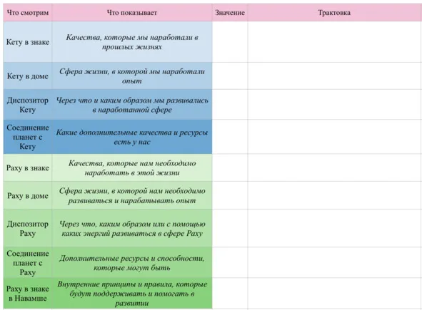 В графе «Значение» необходимо вписать конкретный показатель вашей карты. Например, по строке «Кету в знаке» необходимо написать, в каком знаке зодиака находится Кету в вашей карте. Графа «Трактовка» нужна для того, чтобы вы написали ту трактовку положения, которую узнали из приведенной в этой книге информации. Но не копируйте бездумно, старайтесь писать своими словами. В графе «Мои наблюдения» можете писать любые свои заметки, наблюдения и мысли по тому или иному пункту марафона.