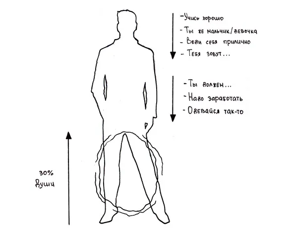 Внешний мир вносит и множество новых мыслей-убеждений. «Надо быть настоящим мужчиной/женщиной» – и мы изучаем веды, обязанности мужчин и женщин. Надо зарабатывать, надо хорошо выглядеть, надо много знать, надо быть хорошим специалистом, надо есть мясо, надо тепло одеваться, надо держать вилку в левой руке. Надо, надо, надо… много чего еще. Все эти мысли проникают в тело, вытесняя Душу из него. Как в законе Архимеда: «Объект, попавший в жидкость, вытесняет из емкости такой же объем этой жидкости». К каким-то годам, Души в человеке становится еще меньше – на уровне половых центров.