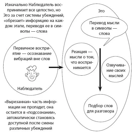 Данный процесс происходит быстро и не всегда линейно. Вот вы увидели что-то и передали, вот увидели, осмыслили, додумали и передали уже дважды обработанную информацию. Или вы начали говорить, а потом внезапно изменили конец фразы – это внутри произошла доработка информации, поскольку вмешался или Наблюдатель, сместив фокус, или Эго, подменив символы-слова, или прошел этот двойственный процесс много раз.