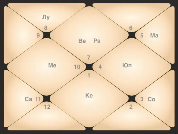 Обратите внимание, какими домами управляет Сатурн – десятым знаком Козерога, в этой карте десятый знак (10) стоит в четвертом доме. А также одиннадцатым знаком Водолея, и одиннадцатый знак (11) в данной карте стоит в пятом доме. Сложности у натива могут возникнуть в сфере недвижимости, потому как четвертый дом – это дом недвижимости и домашнего очага, и в вопросах деторождения, за которые отвечает пятый дом. В данной карте Сатурн находится в собственном знаке. В принципе, Сатурн не плох, но все равно человеку придется приложить чуть больше усилий. И если все это реализовать через дхарму (Юпитер), Сатурн наградит – собственным домом и благостными, хорошими детьми.