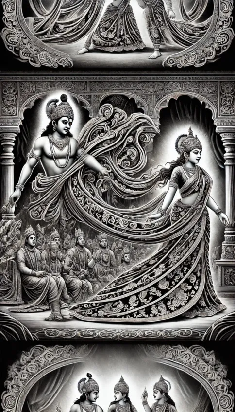 Завистливый принц Кауравов Дурьодхана, который претендовал на руку Драупади, но потерпел поражение, затеял игру в кости и втянул в нее Пандавов. В итоге старший из братьев, азартный Юдхиштхира, спустя несколько партий проиграл Кауравам царство, своих братьев, себя самого, а затем и Драупади. Заполучив ее, младший брат Дурьодханы Духшасана решил, что отныне она – его рабыня. Он коснулся священной косы царицы (что было страшным для нее унижением) и попытался снять с девушки сари, но Кришна, услышав ее мольбы, сделал его ткань бесконечной. И хотя результаты игры были отменены, в повторной игре Пандавы снова проиграли царство. После этого им пришлось отправиться в тринадцатилетнее изгнание, где они приняли решение отомстить Кауравам – не за проигрыш, а за оскорбление жены. По окончании изгнания братья вернулись и потребовали у Дурьодханы царство, принадлежащее им по праву. Однако он отклонил их требование. И хотя Пандавы были готовы отказаться от него взамен на пять деревень, надменный Дурьодхана отверг и это предложение. Битвы было не миновать, и она стала одной из самых разрушительных в истории.