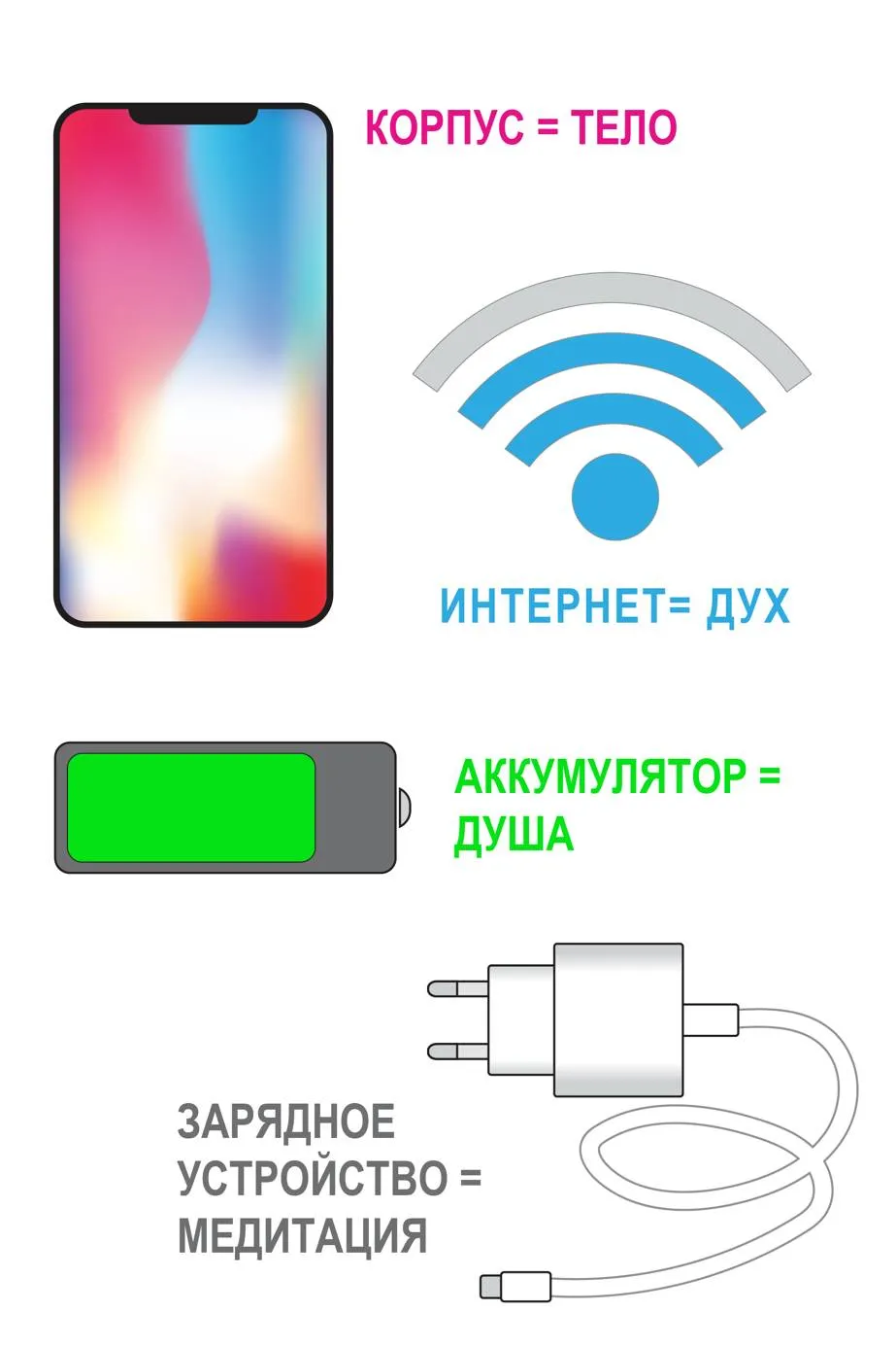 Вокруг нас находятся прекрасные примеры. Я буду использовать пример смартфона, чтобы объяснить взаимосвязь между тремя телами (Иллюстрация 4). Смартфон состоит из трех важных частей: корпуса, аккумулятора и соединения. Корпус смартфона представляет собой физическое тело. Аккумулятор представляет душу. Связь с миром через подключение к интернету (Wifi, 3G, LTE, и т.п.) – это дух.