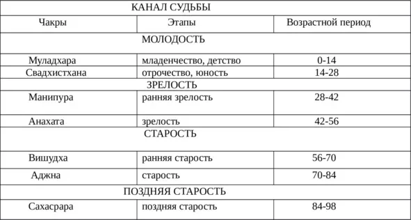 Итак, у нас есть последовательность чакр в виде энергетического канала Сушумна, который является каналом Судьбы, который во времени энергетически поддерживает последовательность Молодость – Зрелость – Старость – Поздняя старость.